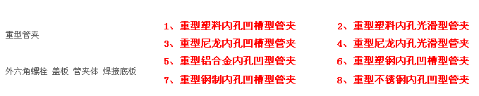 应用领域:本产品适用于冶金,石油,化工,车辆,船舶,电力等机械液压系统中的油、水、气为介质的固定管道。重型系列管夹适用于中高压(PN≤31.5Mpa)管道固定。