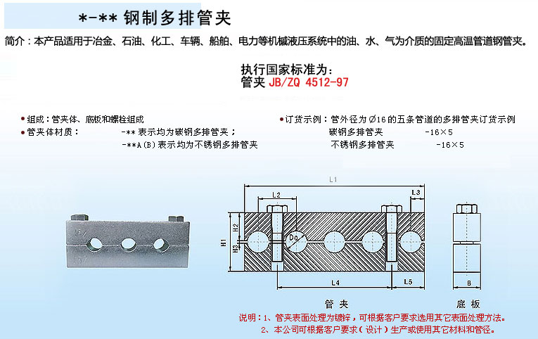 产品特点:钢制多排管夹使用灵活方便,可以固定多根同管径和异径的管道。
