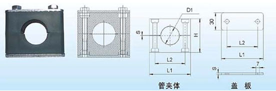 外径 | 管夹体 | 盖板 | 焊接底板 | 螺栓 | ||||||||||