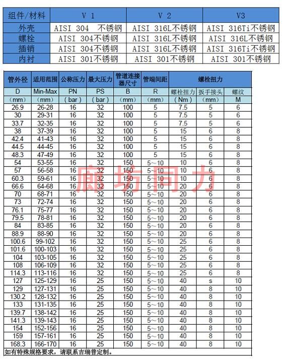 产品特点:此产品采用新型设计,体积小操作方便快捷,管线不需要特殊处理即可完成连接和修补。柔性连接免焊接,特别适合薄壁不锈钢管的低压连接。允许轴向横向偏移,快捷高效,比不锈钢法兰成本低。内附导电条可有效传导设备管线的静电,硅橡胶密封套适用于食品医药设备管线的连接,可拆卸重复使用。