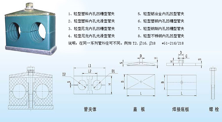 备注:管夹管卡卡箍的型号是按直径来计算的。例如16mm,是指可以用于直径为16mm的管道上;例如16-25mm,是指可以用于直径在16mm-25mm范围内的管道上。