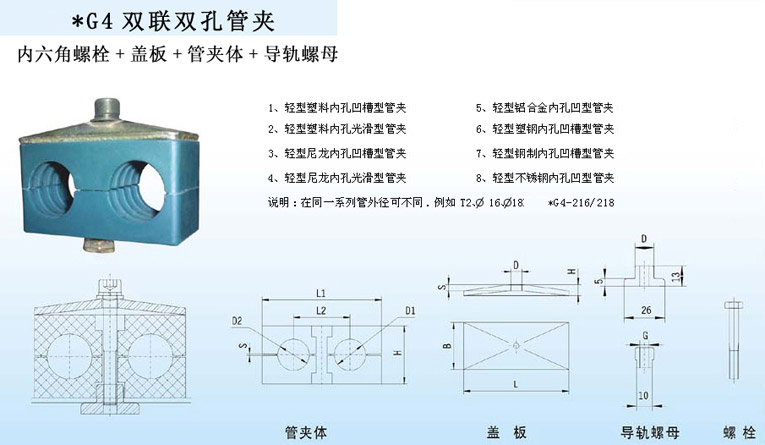 应用领域:本产品适用于冶金、石油、化工、车辆、船舶、电力等机械液压系统中的油、水、气为介质的固定管道。双联系列管夹适用于中低压(PN≤8Mpa)管道固定。